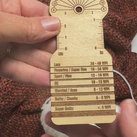 Spin with precision! This multi-use wooden gauge measures wraps per inch, thickness, and twist angle, giving spinners complete control over their yarn. Compact, handcrafted, and naturally unique — a must-have for fiber artists.